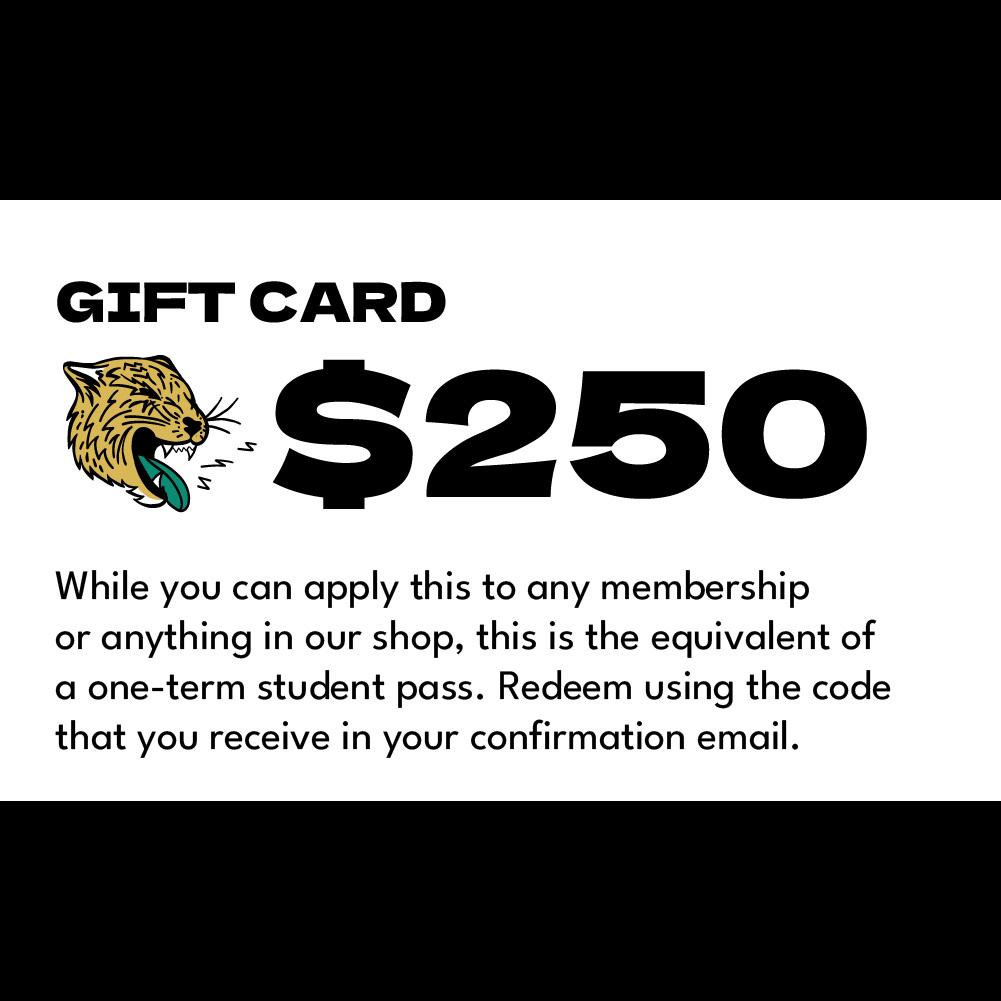 This gift card is equal in value to a month of unlimited family use, or a full term unlimited pass for a student. But, it can also be applied to any membership, drop in pack, or to products in our retail center. Redeem when checking out by using the discount code you receive upon purchase.